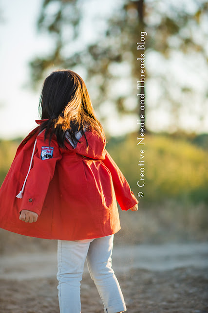 To make this coat, I used a gorgeous red cotton fabric from Cloud9fabrics I found at my local Joann's fabrics store, a variety of wooden buttons (my favorite!). For the lining I used a super cute cotton fabric from my local Hobby Lobby. I love the combination of colors and I also like the fact that the lining coordinates perfectly with the outer fabric. That was completely unplanned! I also added a patch on the left sleeve, just to give it something unique and a pop of contrast color.